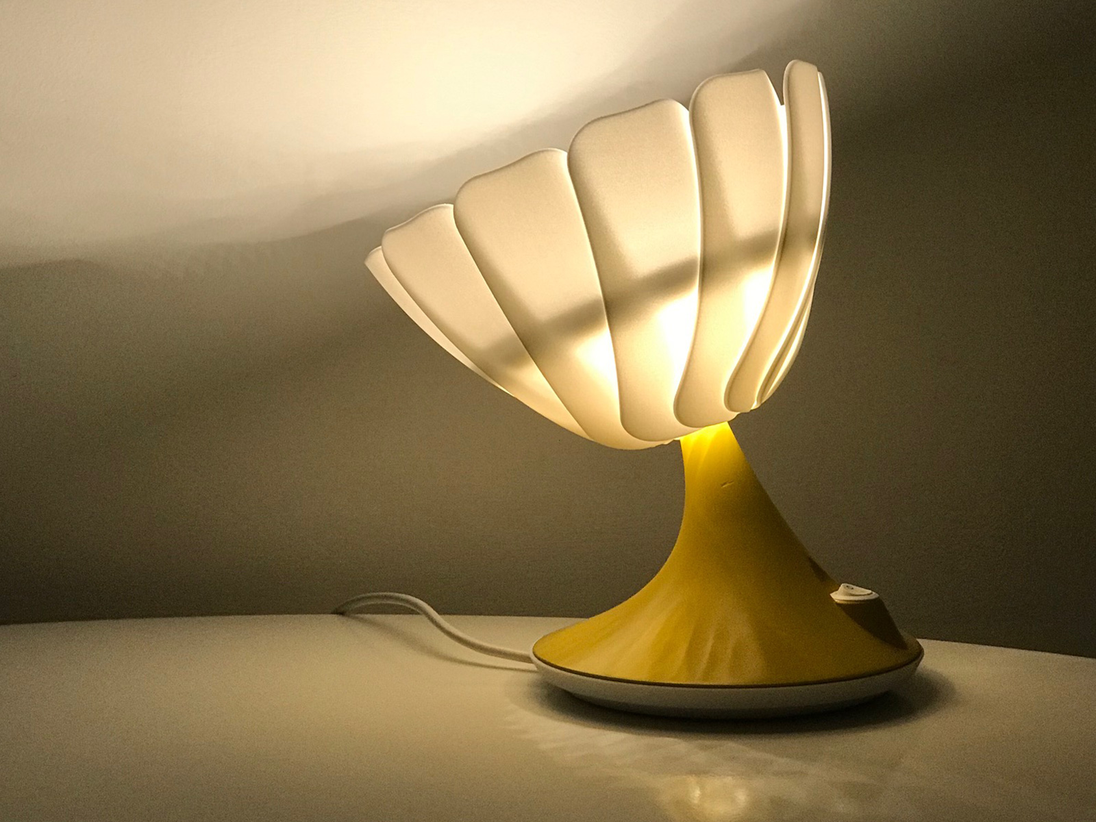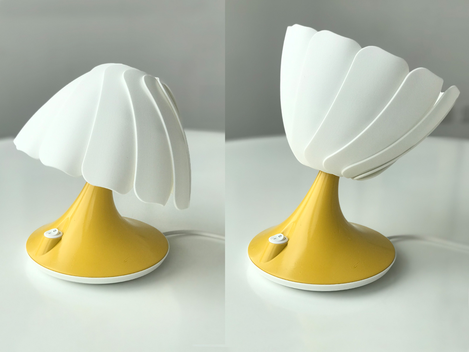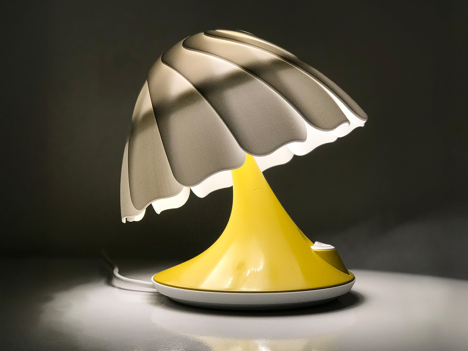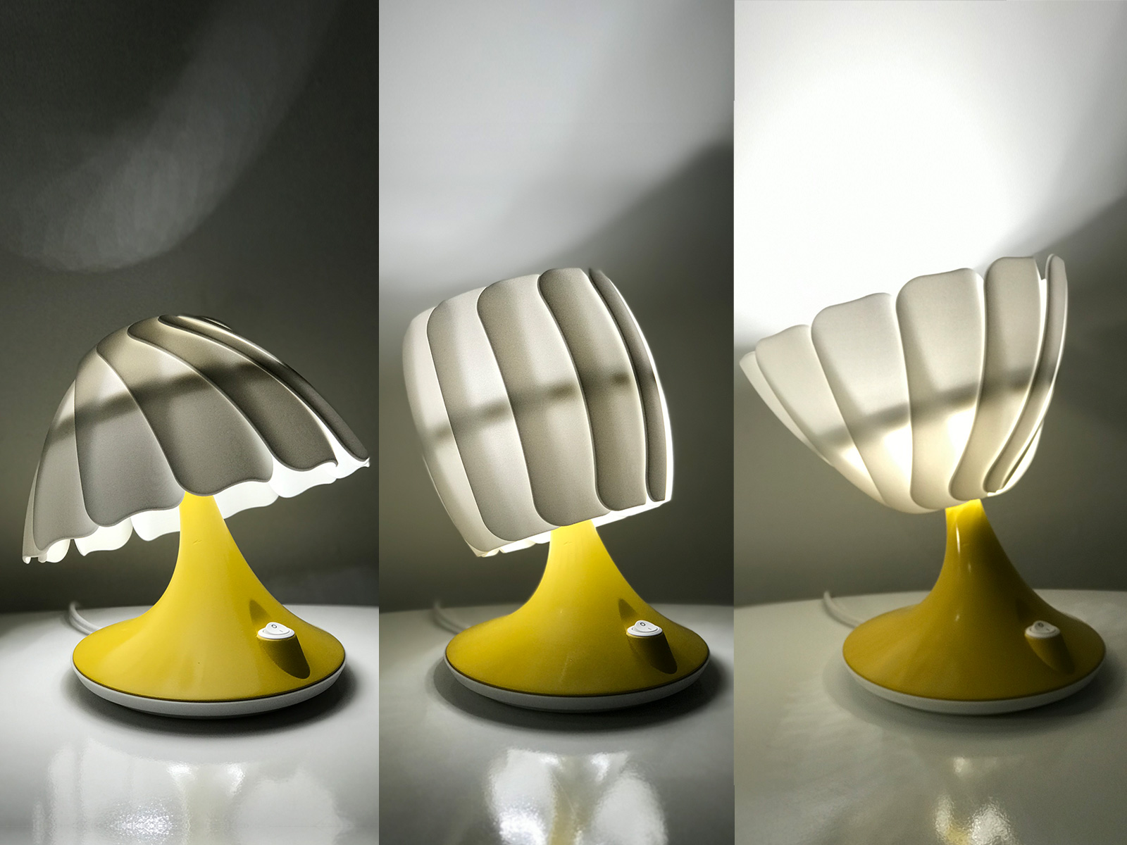 The Nuuvo Light was an internal project to be sold under the Niche London Brand. The brief was to design a table lamp that would offer three types of light; Down-light, Ambient and Up-light. Nuuvo achieves this by using a an array of overlapping petals like a three dimensional camera iris. This allows the lamp shade to invert which directs the light in the chosen direction.